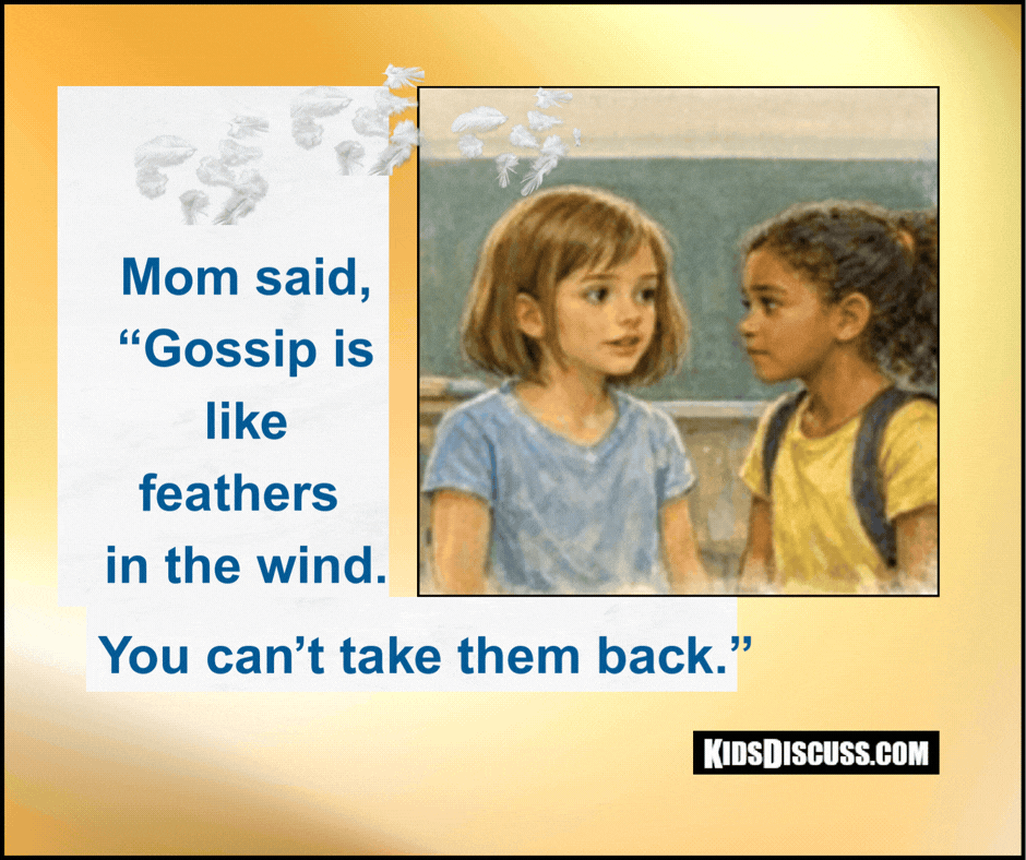 This week’s story reminds us that a single phrase—feathers in the wind—can help children understand why gossip is so hard to undo. Your stories and gentle guidance give your child the courage to choose kindness, even when it’s difficult. For more conversation starters and practical parenting tips, visit KidsDiscuss.com